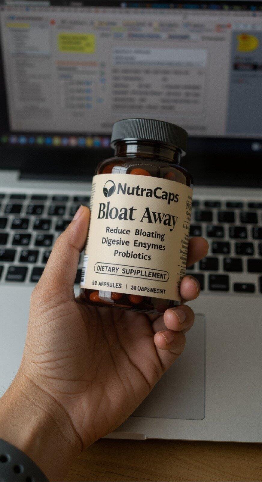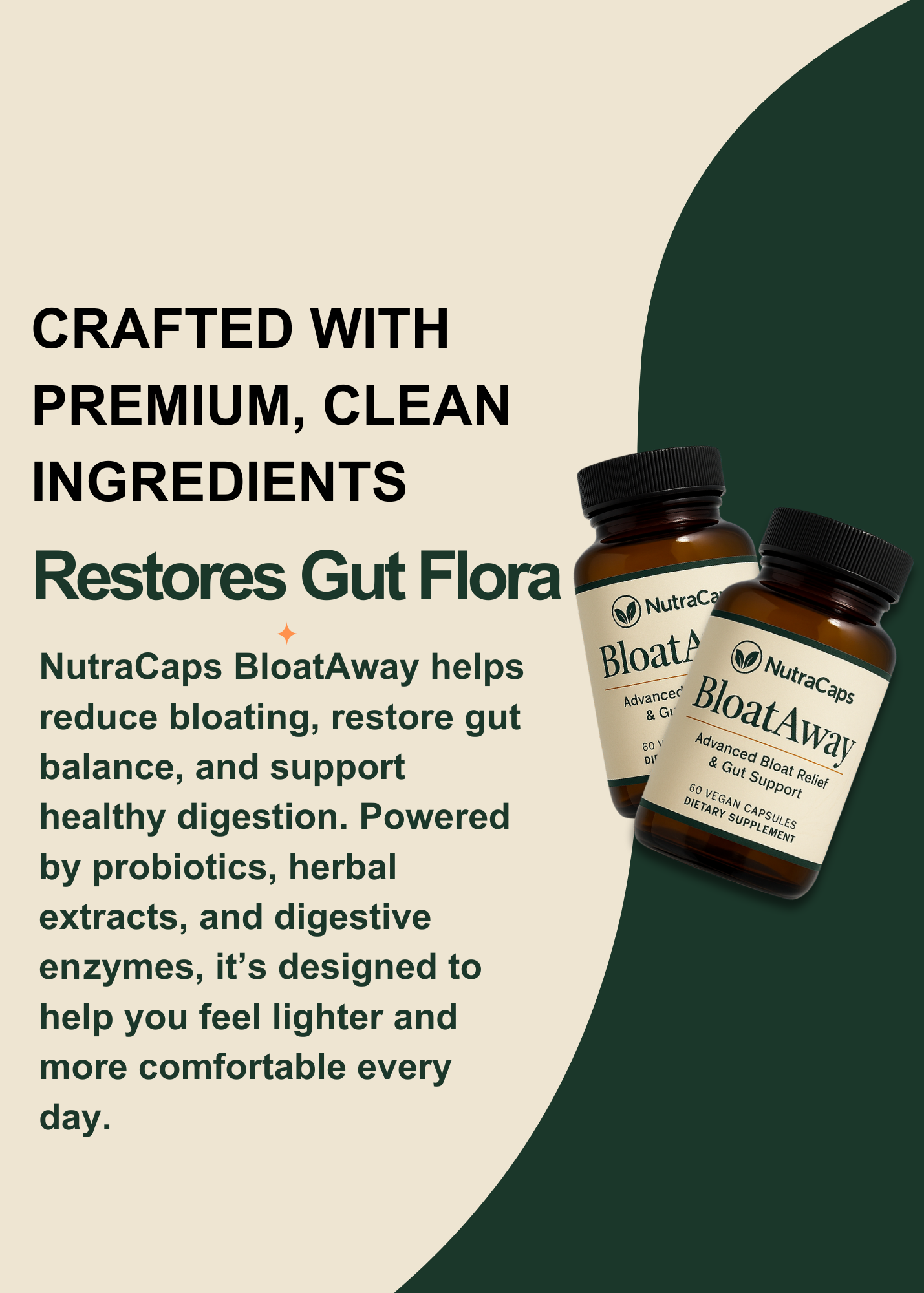 NutraCaps BloatAway is a daily gut support formula made with probiotics, digestive enzymes, and organic herbal extracts. It helps reduce bloating fast, supports a balanced microbiome, and improves digestion — all in one easy supplement.